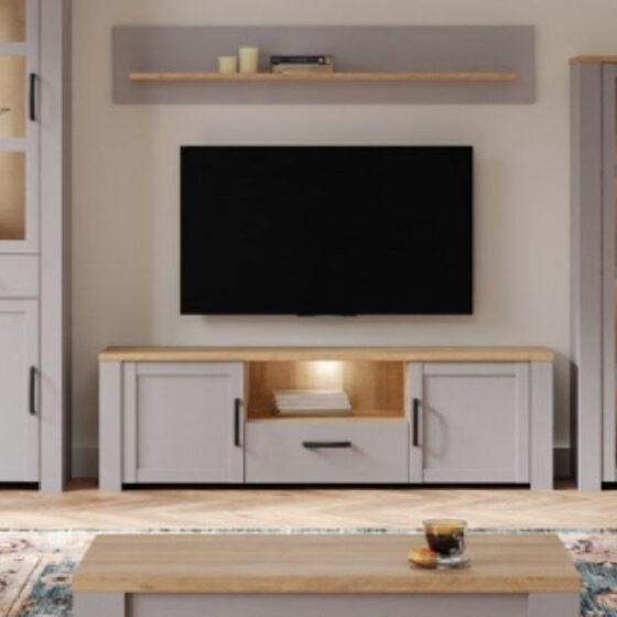 Transform your living space with the Furniture in Fashion Bemidji LED Wooden TV Stand with 2 Doors in Grey and Oak. This modern TV stand combines sleek design with functional storage, making it an ideal choice for any home. The contemporary grey and oak colour scheme gives it a stylish look that complements a variety of interior styles, while the built-in LED lighting adds a touch of sophistication to your entertainment area. With two spacious doors and clever storage solutions, the Bemidji Wooden TV Stand by Furniture in Fashion keeps your media equipment and accessories organized and within easy reach. Whether youre watching movies or hosting a family game night, this TV stand provides both practicality and flair, offering the perfect place for your television, gaming consoles, and other media devices. The Furniture in Fashion Bemidji LED Wooden TV Stand with 2 Doors in Grey and Oak combines innovative design with practical storage solutions. Its modern finish, LED lighting, and ample storage make it a standout piece in any living room, perfect for organizing your media devices while adding a stylish focal point to your space. FEATURES : Material : Wooden Finish : Grey And Oak 1 Led light Black Handles Soft close doors The Bemidji TV Unit combines rustic elegance with modern functionality Featuring black handles and soft-close doors, it comes complete with LED lighting for added style This unit is designed to be a standout in any living space, offering both practicality and a chic, sophisticated look The combination of grey and oak creates a modern, elegant look that enhances any living room decor Made from high-quality wood, this TV stand ensures long-lasting durability and stability for your television and accessories Ideal for storing not just a TV, but also media devices, remote controls, and decor items, offering versatile storage options The smooth surfaces are simple to clean, keeping your TV stand looking pristine with minimal effo