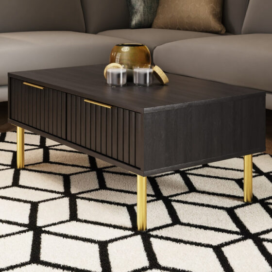 Add sleek sophistication and practical storage to your living space with the Furniture in Fashion Natick Wooden Coffee Table with 2 Drawers in Black. This bold and modern coffee table is designed to elevate the style of any contemporary or minimalist interior. With its rich black finish and clean lines, the Natick coffee table serves as a striking centrepiece while offering everyday functionality. Perfect for living rooms, lounges, or open-plan areas, this coffee table features two spacious drawers ideal for storing remote controls, magazines, coasters, and other essentials. The wide table top provides ample space for decor, drinks, and snacks, while the sturdy wooden build ensures long-lasting use. Whether entertaining guests or enjoying a quiet evening in, this table adds style and convenience to your home. The Furniture in Fashion Natick Wooden Coffee Table with 2 Drawers in Black combines bold style with practical storage, making it a perfect addition to any modern living space seeking both form and function. FEATURES : Material : Wooden Finish : Black, Gold Indulge in the extraordinary with our Natick Range Immerse yourself in the allure of our Natick Coffee Table, designed with woodgrain dimpled foil and captivating gold accents Its sleek black and gold colour scheme will transport you to an enchanting art deco pavilion, creating a stunning centrepiece for your living space In the Natick Range, every piece is thoughtfully designed to offer a unique and exceptional experience Whether it’s the coffee table, lamp table, sideboard, or TV unit, each one represents the perfect blend of elegance and functionality, allowing you to create a home that is truly a masterpiece 2-drawer storage Brushed metal handle Wood grain texture Generous Table top Surface Perfect for drinks, snacks, books, and decorative items Contemporary Design Clean lines and minimalist structure for a modern aesthetic Versatile Use Ideal for living rooms, lounges, or
